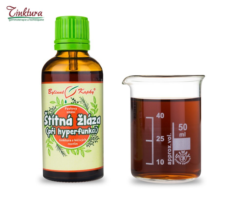 Štítná žláza - při hyperfunkci (bylinná tinktura - Pavlovy bylinné kapky). Přírodní bylinný extrakt z léčivých rostlin pro snížení zvýšené funkce štítné žlázy (pro snížení hypertyreózy - hyperfunkce štítné žlázy).